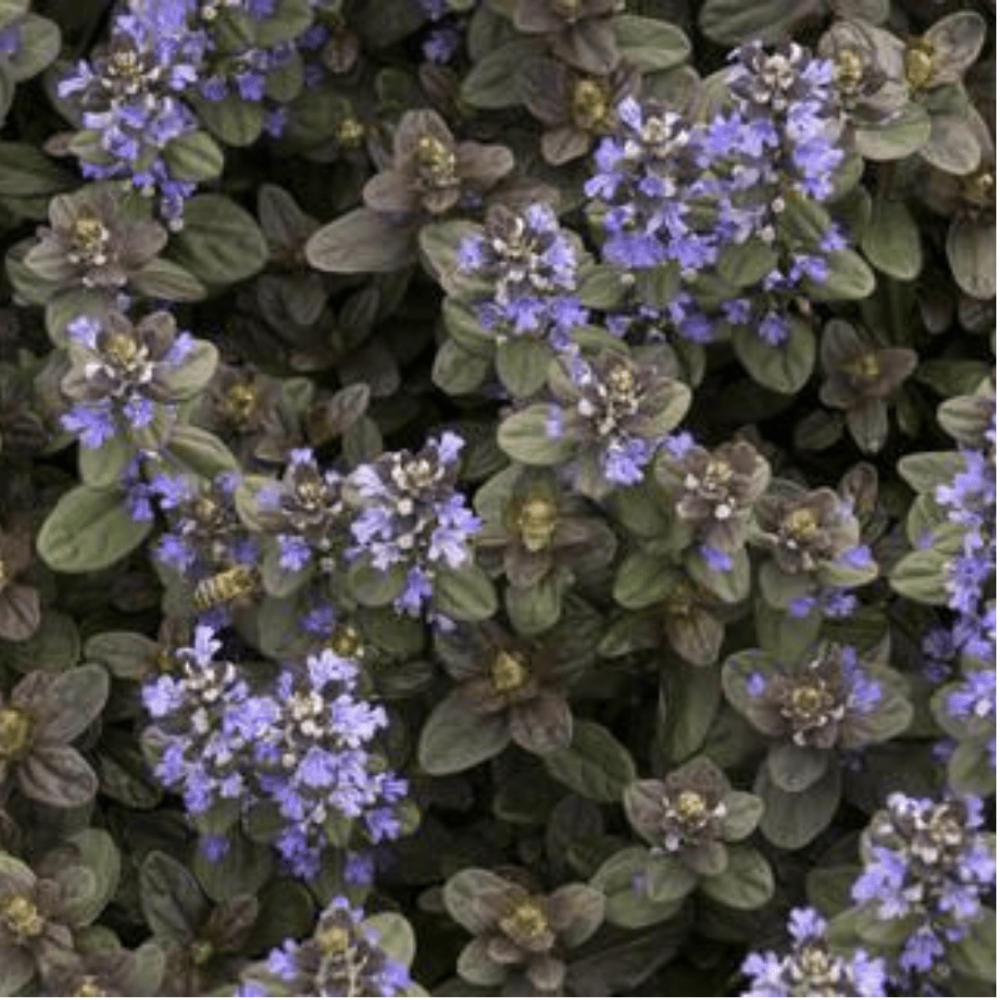 Ajuga Chocolate Chip (Ajuga reptans ‘chocolate chip’) is a quick spreading flowering groundcover with rich, chocolate brown foliage. Lavender-blue flower spikes rise from the foliage in late Spring to early Summer and may repeat bloom. This deer and rabbit resistant perennial thrives where other groundcovers may fail and is ideal for planting beneath trees and shrubs, on slopes, between stepping stones, and even containers. Producing 3” foliage and flowering spikes of up to 6”, the Ajuga Chocolate Chip may be the perfect groundcover for your needs, with the added convenience of no fertilization needed. The Bugleweed is easy to care for; it only needs to be thinned every few years and it can be pruned after blooming using a high raised mower. When looking for a low-lying spreading perennial, this groundcover is an optimal choice.